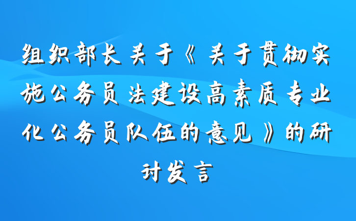《组织部长关于《关于贯彻实施公务员法建设高素质专业化公务员队伍的意见》的研讨发言》内容摘要:下面,我就学习了《关于贯彻实施公务员法建设高素质专业化公务员队伍的意见》《中共XXXX市委办公厅印发的通知》,谈谈自己的体会。201x年12月29日,第十三届全国人大常委会第七次会议表决通过了《中华人民共和国公务员法修订草案》。这是我国公务员制度发展史上的一件大事,对于认真贯彻习近平新时代中国特色社。